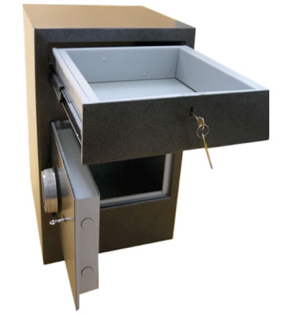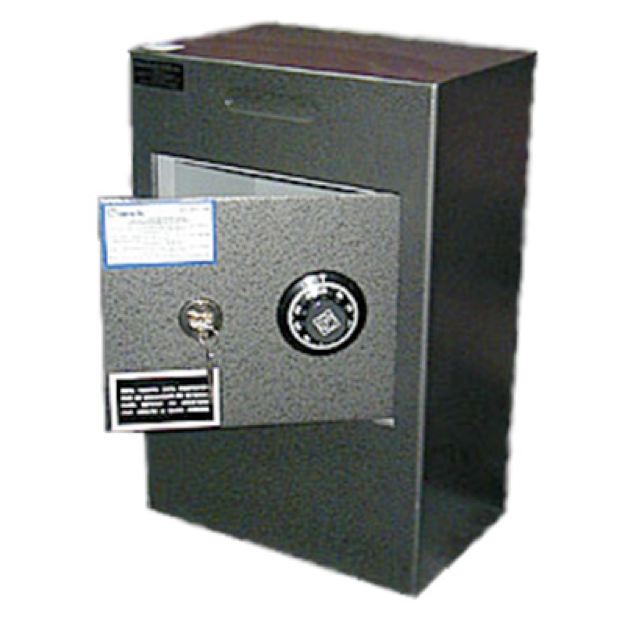 Accionado el botón, se vuelca en fondo del cajón billetero atesorando automáticamente el monto allí manteniendo en el buzón de seguridad inferior dotado de cerradura con retardo.
