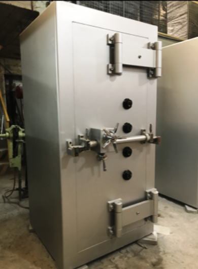 CASCO: Formado en el frente por ángulos de 12,7 x 6,35mm. El perímetro total lleva 2 escalones finamente pulidos y esmerilados que corresponden con los de la puerta formando un cierre hermético. El casco exterior es de chapa de acero de 6,35mm y el interior en 2mm en todo su perímetro lleva block de fundición de 40mm. Aleación especial con una dureza no menor de 450 Brinell. Fijado con material de consistencia granítica, formando un espesor sólido de 125 mm.