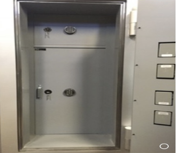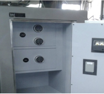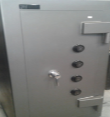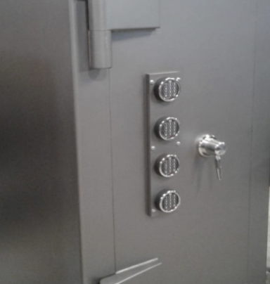 Con una cerradura a llave doble paleta doble vuelta de seis combinaciones laminares y dos electrónicas o mecánicas con tiempo e retardo programable.